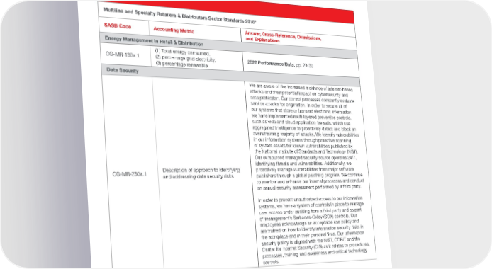 PENSKE AUTOMOTIVE / 2021 ESG REPORT 31 2020 SASB Index SASB Sector Standards 2018* 2020 SASB INDEX Multiline and Specialty Retailers & Distributors Sector Standards 2018* SASB Code Accounting Metric Answer, Cross-Reference, Ommissions, and Explanations Energy Management in Retail & Distribution CG-MR-130a.1 (1) Total energy consumed, (2) percentage grid electricity, (3) percentage renewable 2020 Performance Data , pp. 29-30 Data Security CG-MR-230a.1 Description of approach to identifying and addressing data security risks We are aware of the increased incidence of internet-based attacks and their potential impact on cybersecurity and data protection. Our control processes constantly evaluate service attacks for origination. In order to secure all of our systems that store or transmit electronic information, we have implemented multi-layered preventive controls, such as web and cloud application firewalls, which use aggregated intelligence to proactively detect and block an overwhelming majority of attacks. We identify vulnerabilities in our information systems through proactive scanning of system assets for known vulnerabilities published by the National Institute of Standards and Technology (NIST). Our outsourced managed security source operates 24/7, identifying threats and vulnerabilities. Additionally, we proactively manage vulnerabilities from major software publishers through a global patching program. We continue to monitor and enhance our internal processes and conduct an annual security assessment performed by a third party. In order to prevent unauthorized access to our information systems, we have a system of controls in place to manage user access under auditing from a third party and as part of management’s Sarbanes-Oxley (SOX) controls. Our employees acknowledge an acceptable use policy and are trained on how to identify information security risks in the workplace and in their personal lives. Our information security policy is aligned with the NIST, COBIT and the Center for Internet Security (CIS) as it relates to procedures, processes, training and awareness and critical technology controls. *Penske Automotive Group’s 2021 ESG Report applies the 2018 version of the Multiline and Specialty Retailers & Distributors Sustainability Accounting Standards; “2018” refers to the Standards issue date, not the date of information presented in this report.
