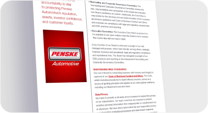 PENSKE AUTOMOTIVE / 2021 ESG REPORT 26 • Compensation Committee: The Compensation Committee reviews and approves the compensation of each of the company’s executive officers. Additionally, the Committee approves corporate goals and objectives tied to compensation and benefit plans and manages our succession planning. • Nominating and Corporate Governance Committee: The Nominating and Corporate Governance Committee reviews the size, responsibilities and composition of the Board and evaluates new Board candidates as needed. Additionally, the Committee is responsible for the development and implementation of the corporate governance guidelines and Code of Business Conduct and Ethics and oversees our compliance with legal and regulatory requirements and ESG practices and reporting. • Executive Committee: The Executive Committee’s purpose is to be available to act upon matters when the Board is not in session. This Committee did not meet in 2020. A key function of our Board is informed oversight of our risk management process, which risks include, among others, strategic, financial, business and operational, legal and regulatory compliance, and reputational risks. The Board has delegated oversight of our ESG practices and reporting to the independent Nominating and Corporate Governance Committee. MAINTAINING HIGH STANDARDS Our commitment to conducting business with honesty and integrity is captured in our Code of Business Conduct and Ethics . The Code, which includes procedures to report ethical concerns, serves as a source of guiding principles and applies to our entire global workforce, including our Board and executive team. Data Privacy We make it a priority in all areas of our business to respect the privacy of our stakeholders. Our team members are required to protect sensitive personal information from inappropriate or unauthorized use or disclosure. We have also implemented fair and responsible privacy and information protection procedures and data breach response plans that comply with applicable laws. In addition, we are committed to enabling our team members and customers to exercise full rights to their data. In the U.K., we fully comply with the General Data Protection Regime (GDPR) which gives team members and customers the right to see, and in some cases, delete their data. We also fully comply with Adherence to sound principles of corporate governance through a system of checks, balances, and personal accountability is vital to protecting Penske Automotive’s reputation, assets, investor confidence, and customer loyalty.