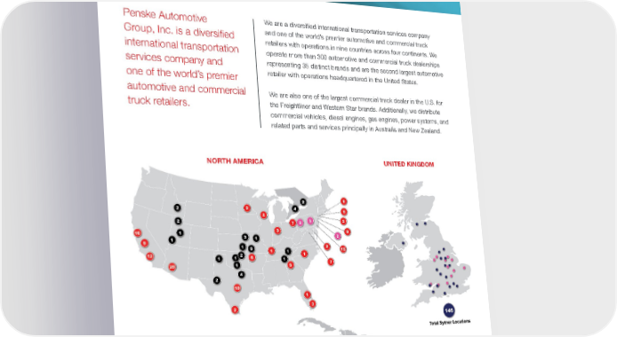 6 ABOUT PENSKE AUTOMOTIVE GROUP We are a diversified international transportation services company and one of the world’s premier automotive and commercial truck retailers with operations in nine countries across four continents. We operate more than 300 automotive and commercial truck dealerships representing 35 distinct brands and are the second largest automotive retailer with operations headquartered in the United States. We are also one of the largest commercial truck dealer in the U.S. for the Freightliner and Western Star brands. Additionally, we distribute commercial vehicles, diesel engines, gas engines, power systems, and related parts and services principally in Australia and New Zealand. Penske Automotive Group, Inc. is a diversified international transportation services company and one of the world’s premier automotive and commercial truck retailers. PENSKE AUTOMOTIVE / 2021 ESG REPORT NORTH AMERICA PAG MARKETS North America numbers indicate number of franchise locations in that market UNITED KINGDOM