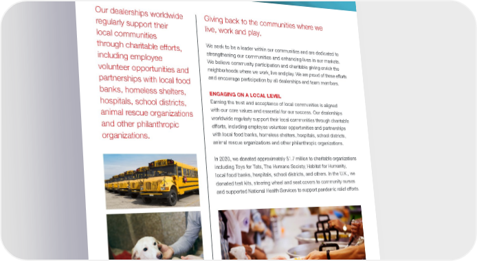 PENSKE AUTOMOTIVE / 2021 ESG REPORT 22 SERVING COMMUNITIES Giving back to the communities where we live, work and play. We seek to be a leader within our communities and are dedicated to strengthening our communities and enhancing lives in our markets. We believe community participation and charitable giving enrich the neighborhoods where we work, live and play. We are proud of these efforts and encourage participation by all dealerships and team members. ENGAGING ON A LOCAL LEVEL Earning the trust and acceptance of local communities is aligned with our core values and essential for our success. Our dealerships worldwide regularly support their local communities through charitable efforts, including employee volunteer opportunities and partnerships with local food banks, homeless shelters, hospitals, school districts, animal rescue organizations and other philanthropic organizations. In 2020, we donated approximately $1.7 million to charitable organizations including Toys for Tots, The Humane Society, Habitat for Humanity, local food banks, hospitals, school districts, and others. In the U.K., we donated test kits, steering wheel and seat covers to community nurses and supported National Health Services to support pandemic relief efforts. Our dealerships worldwide regularly support their local communities through charitable efforts, including employee volunteer opportunities and partnerships with local food banks, homeless shelters, hospitals, school districts, animal rescue organizations and other philanthropic organizations.