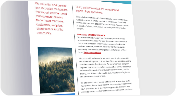 PENSKE AUTOMOTIVE / 2021 ESG REPORT 19 OPERATING SUSTAINABLY We value the environment and recognize the benefits that robust environmental management delivers to our team members, customers, suppliers, shareholders and the community. Taking action to reduce the environmental impact of our operations. Penske Automotive is committed to sustainability across our operations. We hold ourselves to a higher standard of environmental stewardship in areas where we have greater impact and influence. We push ourselves to operate efficiently, use resources responsibly and limit our carbon footprint. MANAGING OUR PERFORMANCE We are committed to monitoring and managing the environmental impacts of our businesses. We value the environment and recognize the benefits that robust environmental management delivers to our team members, customers, suppliers, shareholders and the community. Our commitment to operating sustainably is outlined in our Environmental Policy . We partner with environmental and safety consulting firms to assist in compliance with specific local and federal laws and regulations relating to environmental and safety issues. The consulting firms, along with corporate team members, make periodic visits to both our dealerships and our collision centers to conduct on-site assessments, provide training, and aid in compliance with laws, regulations, safety issues and environmental requirements. We also provide safety training on topics such as hazardous waste management, hazard communication plans, emergency response and injury prevention plans, and respiratory protection. Corporate team members perform quarterly audits to assure and maintain compliance.