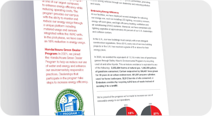 PENSKE AUTOMOTIVE / 2021 ESG REPORT 20 REDUCING OUR ENERGY USE AND GHG EMISSIONS Reducing our energy use and greenhouse gas (GHG) emissions is important to our customers, team members and company leadership. We recognize our responsibility to advocate for a cleaner environment through self-awareness, leveraging our global partnerships, promoting cleaner driving vehicles through our dealership and reducing pollution and waste. Embracing Energy Efficiency At our facilities, we have deployed several strategies for reducing our energy use, such as installing LED lighting, occupancy sensors, energy-efficient glass, and high-efficiency heating, ventilation and air conditioning (HVAC) systems. Moreover, we have completed LED lighting upgrades at approximately 60 percent of our U.S. dealerships and collision centers. In the U.K., our new buildings must comply with more stringent construction regulations. Since 2013, every one of our new building projects in the U.K. has received a grade of B or above for their energy plans. In 2020, we avoided the equivalent of 13,755 metric tons of greenhouse gasses through Safety Kleen’s Environmental Programs by recycling used oil and other liquids. This emissions avoidance is equivalent to any of the following: 2,592,584 therms of natural gas , 1,542,300 gallons of gasolione consumed , Carbon sequestred by 356,487 trees grown for 10 years in an urban environment , 561,697 propane cylinders used for home barbeques , 32,012 barrels of oils consumed , or Emissions avoided by recycling 4,810 tons of waste instead of sending it to a landfill . We’re proud of the progress we’ve made to increase our use of renewable energy in our operations. Leveraging partnerships to reduce energy use Shell Energy Solutions: In partnership with Shell, we’re piloting an energy savings program at one of our largest campuses to enhance energy efficiency while reducing operating costs. The program provides our campus with the ability to monitor and reduce our energy usage through a unique platform including metered usage and sensors integrated within the HVAC units. In the pilot phase, we have seen an 18% reduction in energy usage. Honda/Acura Green Dealer Program: In 2021, we joined the Honda/Acura Green Dealer Program to help us reduce our use of water and energy and enhance our environmentally responsible practices. Dealerships that participate in the program take steps to increase energy efficiency. 82% 18% 73% 27% 2019 2020 Electricity Use ■ Renewable ■ Non-renewable