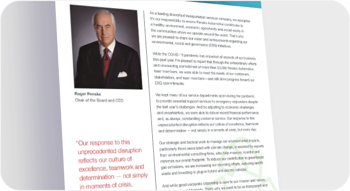 PENSKE AUTOMOTIVE / 2021 ESG REPORT 4 A MESSAGE FROM OUR CHAIRMAN AND CEO As a leading diversified transportation services company, we recognize it’s our responsibility to ensure Penske Automotive contributes to a healthy environment, economic opportunity and social equity in the communities where we operate around the world. That’s why we are pleased to share our vision and achievements regarding our environmental, social and governance (ESG) initiatives. While the COVID-19 pandemic has impacted all aspects of our business this past year, I’m pleased to report that through the extraordinary efforts and unwavering commitment of more than 23,000 Penske Automotive team members, we were able to meet the needs of our customers, stakeholders, and team members—and still drive progress toward our ESG commitments. We kept many of our service departments open during the pandemic to provide essential support services to emergency responders despite the last year’s challenges. And by adjusting to economic challenges and uncertainties, we were able to deliver record financial performance and, as always, outstanding customer service. Our response to this unprecedented disruption reflects our culture of excellence, teamwork and determination — not simply in moments of crisis, but every day. Our strategic and tactical work to manage our environmental impacts, particularly those associated with climate change, is assisted by experts from environmental consulting firms, who help measure, monitor and minimize our overall footprint. To reduce our contribution to greenhouse gas emissions, we are increasing our recycling efforts, reducing landfill waste and investing in plug-in hybrid and electric vehicles. And while good corporate citizenship is core to our mission and values, so is integrity and honesty. That’s why we want to be as transparent and purposeful as possible as we navigate the many aspects of ESG and integrate those that are most relevant into our strategy. “Our response to this unprecedented disruption reflects our culture of excellence, teamwork and determination — not simply in moments of crisis, but every day.” Roger Penske Chair of the Board and CEO