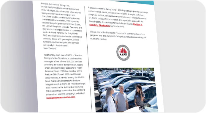 PENSKE AUTOMOTIVE / 2021 ESG REPORT 3 Penske Automotive Group’s 2021 ESG Report highlights the company’s environmental, social, and governance (ESG) strategies, activities, progress, metrics, and performance for January 1 through December 31, 2020, unless otherwise noted. The report also aligns with the Sustainability Accounting Standards Board (SASB) Multiline & Specialty Distributors sector standard. We are committed to regular, transparent communication of our progress and look forward to bringing our stakeholders along with us on this journey. ABOUT THIS REPORT Penske Automotive Group, Inc., (NYSE:PAG) headquartered in Bloomfield Hills, Michigan, is a diversified international transportation services company and one of the world’s premier automotive and commercial truck retailers. PAG operates dealerships principally in the United States, the United Kingdom, Canada, Germany, and Italy and is the largest retailer of commercial trucks in North America for Freightliner. PAG also distributes and retails commercial vehicles, diesel and gas engines, power systems, and related parts and services principally in Australia and New Zealand. Additionally, PAG owns 28.9% of Penske Transportation Solutions, a business that manages a fleet of over 330,000 vehicles providing innovative transportation, supply chain, and technology solutions to North American fleets. PAG is a member of the Fortune 500, Russell 1000, and Russell 3000 indexes, is ranked among the World’s Most Admired Companies by Fortune Magazine and, in 2021, 35 PAG dealerships were named to the Automotive News Top 100 Dealerships to Work For. For additional information, visit the company’s website at www.penskeautomotive.com .
