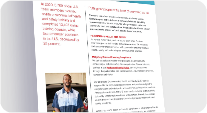 PENSKE AUTOMOTIVE / 2021 ESG REPORT 12 SUPPORTING TEAM MEMBERS Putting our people at the heart of everything we do. The most important investments we make are in our people. Everything we aspire to be as a company builds on our ability to come together as one team. We take pride in our culture of teamwork, trust and collaboration. We prioritize health and support one another to ensure we’re all able to do our best work. PRIORITIZING HEALTH AND SAFETY At Penske Automotive, we look out for each other. Our team members give us their loyalty, dedication and trust. We recognize their commitment and match it with our own by ensuring that their health, safety and well-being are among our top priorities. Mitigating Risk and Ensuring Compliance We value a safe and healthy workplace and are committed to conducting all activities safely. We recognize that this commitment, outlined in our Health and Safety Policy , can only be achieved through the participation and cooperation of every manager, employee, contractor and visitor. Our corporate Environmental, Health and Safety (EHS) team is responsible for implementing procedures and policies designed to mitigate health and safety risks across all Penske Automotive locations. Among other activities, the EHS team conducts formal audits quarterly to identify unsafe work conditions and practices. Periodic inspections ensure that work environments consistently meet our high health and safety standards. When it comes to health and safety, compliance is integral to the Penske culture. If something isn’t working or appears unsafe, we encourage team members to communicate their concerns to their managers. By creating open lines of communication, we create safe workplaces and instill in our team members a sense of ownership and pride. In 2020, our operations received an industry-leading score of 94 out of 100 from our third-party environmental advisor. In 2020, 5,709 of our U.S. team members received onsite environmental health and safety training and completed 13,497 online training courses, while team member accidents in the U.S. decreased by 29 percent. Trevor Gethers, a 7-year PAG employee, is a technician at Honda of Escondido and a Marine veteran.