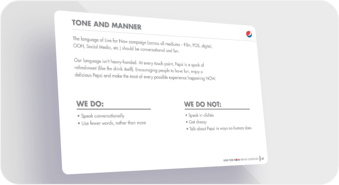 TONE AND MANNER The language of Live for Now campaign (across all mediums – Film, POS, digital, OOH, Social Media, etc.) should be conversational and fun. Our language isn’t heavy-handed. At every touch point, Pepsi is a spark of refreshment (like the drink itself). Encouraging people to have fun, enjoy a delicious Pepsi and make the most of every possible experience happening NOW. WE DO: WE DO NOT: t4QFBLDPOWFSTBUJPOBMMZ t4QFBLJODMJDIÏT t6TFGFXFSXPSET SBUIFSUIBONPSF t(FUDIFFTZ t5BMLBCPVU1FQTJJOXBZTOPIVNBOEPFT LIVE FOR N W BRAND GUIDELINES 42