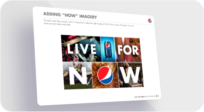Pepsi Brand Book Page 43 Page 45ADDING “NOW” IMAGERY The grid works like a puzzle, and it is important to select the right images to "ll the “Now” boxes of the grid. A mix of close-ups and wides works best. LIVE FOR N W BRAND GUIDELINES 59