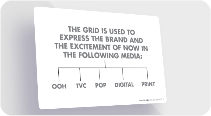 THE GRID IS USED TO EXPRESS THE BRAND AND THE EXCITEMENT OF NOW IN THE FOLLOWING MEDIA: OOH TVC POP DIGITAL PRINT LIVE FOR N W BRAND GUIDELINES 12