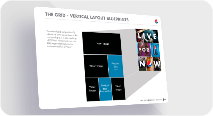 THE GRID - VERTICAL LAYOUT BLUEPRINTS The vertical grid compositionally follows the same conventions of the horizontal grid. It is also made up of (1) Pepsi refreshment cues and “Now” Image (2) imagery that captures the excitment and fun of “now”. Product “Now” Image Box (Can) “Now” Product “Now” Image Box Image (Refreshment Cue) LIVE FOR N W BRAND GUIDELINES 48