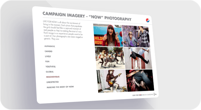 CAMPAIGN IMAGERY - “NOW” PHOTOGRAPHY LIVE FOR NOW is all about the excitement of living in the moment. Each photo that populates the grid should feel like a captured moment of real people as they’re making the most of now. Each image is an experience people want to be a part of. Our photographs are never staged or generic. They are: AUTHENTIC CANDID LIVELY FUN YOUTHFUL GLOBAL MISCHIEVOUS UNEXPECTED MAKING THE MOST OF NOW LIVE FOR N W BRAND GUIDELINES 26