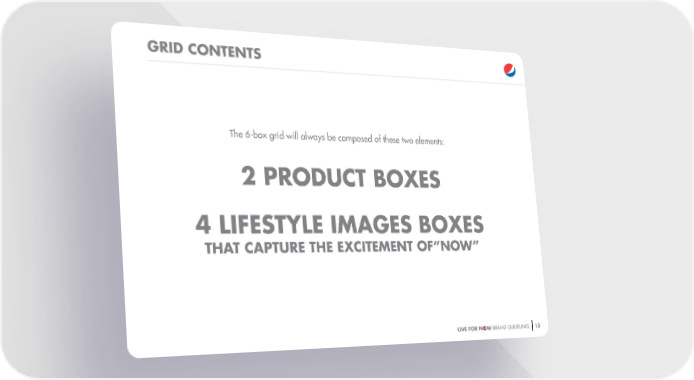 Pepsi Brand Book Page 5 Page 7GRID CONTENTS The 6-box grid will always be composed of these two elements: 2 PRODUCT BOXES 4 LIFESTYLE IMAGES BOXES THAT CAPTURE THE EXCITEMENT OF“NOW” LIVE FOR N W BRAND GUIDELINES 13