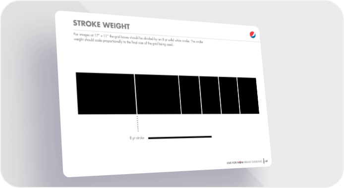 STROKE WEIGHT For images at 17” x 11” the grid boxes should be divided by an 8 pt solid white stroke. The stroke weight should scale proportionally to the "nal size of the grid being used. 8 pt stroke LIVE FOR N W BRAND GUIDELINES 69