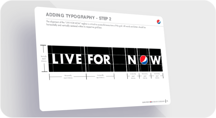 71 LIVE FOR N W BRAND GUIDELINES ADDING TYPOGRAPHY - STEP 2 The alignment of the “LIVE FOR NOW” tagline is critical to successful executions of the grid. All words and letters should be horizontally and vertically centered within its respective grid box. Vertically equal distance. Horizontally equal distance. Horizontally equal distance. Horizontally equal distance. Horizontally equal distance. Horizontally equal distance.