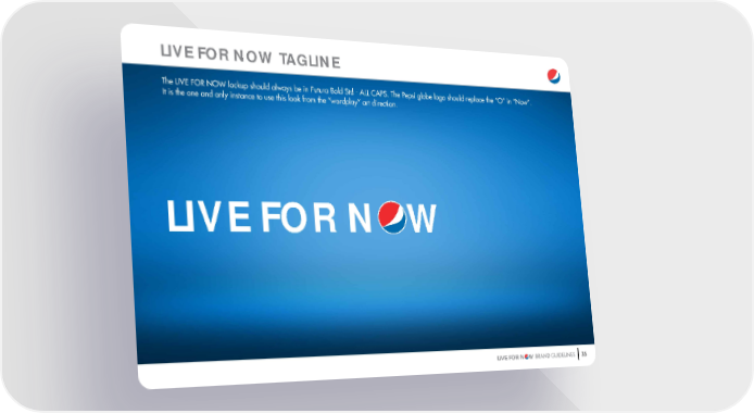 35 LIVE FOR N W BRAND GUIDELINES LIVE FOR N W The LIVE FOR NOW lockup should always be in Futura Bold Std - ALL CAPS. The Pepsi globe logo should replace the “O” in “Now”. It is the one and only instance to use this look from the “wordplay” art direction. LIVE FOR NOW TAGLINE