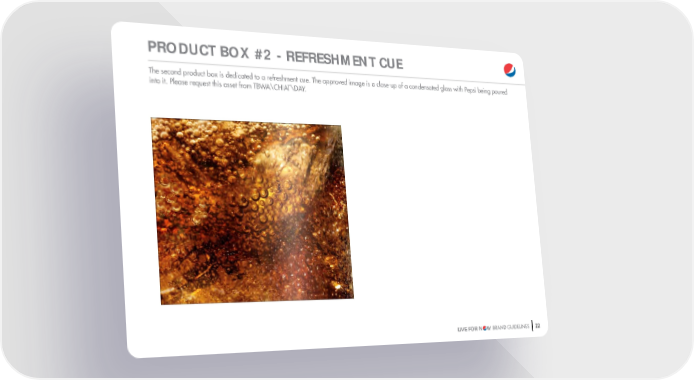 22 LIVE FOR N W BRAND GUIDELINES The second product box is dedicated to a refreshment cue. The approved image is a close-up of a condensated glass with Pepsi being poured into it. Please request this asset from TBWA\CHIAT\DAY. PRODUCT B O X #2 - REFRESHMENT CUE
