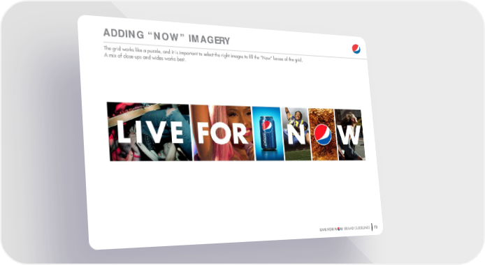Pepsi Brand Book Page 57 Page 5973 LIVE FOR N W BRAND GUIDELINES ADDING “NOW” IMAGERY The grid works like a puzzle, and it is important to select the right images to " ll the “Now” boxes of the grid. A mix of close-ups and wides works best.