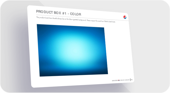 Pepsi Brand Book Page 10 Page 1218 LIVE FOR N W BRAND GUIDELINES The product (can) box should always be on the blue vignetted background. Please request the asset from TBWA\CHIAT\DAY. PRODUCT B O X #1 - COLOR