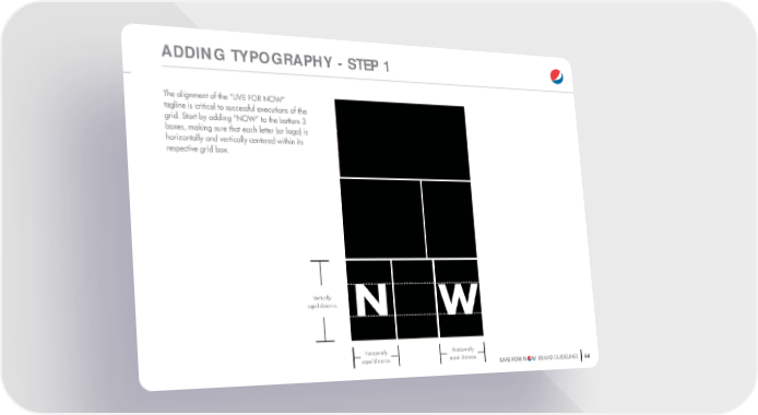 64 LIVE FOR N W BRAND GUIDELINES Vertically equal distance. Horizontally equal distance. Horizontally equal distance. ADDING TYPOGRAPHY - STEP 1 The alignment of the “LIVE FOR NOW” tagline is critical to successful executions of the grid. Start by adding “NOW” to the bottom 3 boxes, making sure that each letter (or logo) is horizontally and vertically centered within its respective grid box.