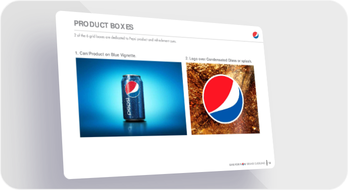 Pepsi Brand Book Page 8 Page 1016 LIVE FOR N W BRAND GUIDELINES 2 of the 6 grid boxes are dedicated to Pepsi product and refreshment cues. 1. Can/Product on Blue Vignette. 2. Logo over Condensated Glass or splash. PRODUCT B O X ES