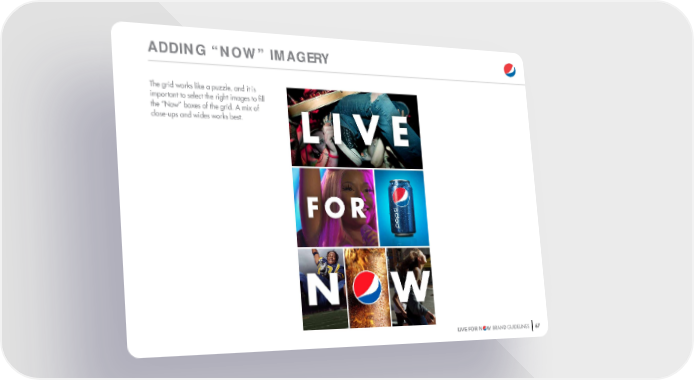Pepsi Brand Book Page 51 Page 5367 LIVE FOR N W BRAND GUIDELINES ADDING “NOW” IMAGERY The grid works like a puzzle, and it is important to select the right images to " ll the “Now” boxes of the grid. A mix of close-ups and wides works best.