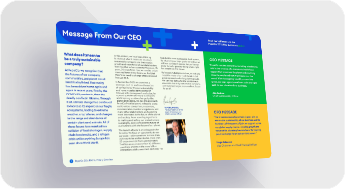 What does it mean to be a truly sustainable company? At PepsiCo, we recognize that the futures of our company, communities, and planet are all inextricably linked. That reality has been driven home again and again in recent years, first by the COVID-19 pandemic, then the deadly conflict in Ukraine. Through it all, climate change has continued to increase its impact on our fragile ecosystems, leading to extreme weather, crop failures, and changes in the range and abundance of certain plants and animals. All of these issues have resulted in a collision of food shortages, supply chain bottlenecks, and a refugee crisis unlike anything Europe has seen since World War II. In this context, we have been thinking hard about what it means to be a truly sustainable company, one that creates growth and value for all of our stakeholders. We know that to be successful five years, 10 years, 20 years from now, we need to create more resilience in our business. And that means we need to change what we do and how we do it. In September 2021 we launched a strategic, end-to-end transformation of our business. We put sustainability and human capital at the center of how we will create growth and value, by operating within planetary boundaries and inspiring positive change for the planet and people. We call this approach PepsiCo Positive (pep+), reflecting a new reality where consumers, customers, our associates, investors, regulators, and many other stakeholders are becoming more interested in the future of the planet and society. From sourcing ingredients to making and selling our products more sustainably, pep+ connects the future of our business with the future of our planet. The launch of pep+ is a turning point for PepsiCo. We have an opportunity to use our scale — with operations in more than 200 countries and territories, more than 25 crops sourced from approximately 7 million acres in more than 30 different countries, and more than one billion interactions with consumers each day — to help build a more sustainable food system. By advancing our pep+ goals, we believe we will be a consistent top market performer and a force for good by doing what’s right for people and the planet. By becoming better ourselves, we not only meet the needs of our stakeholders but position ourselves for long-term growth. We can help define for the world what it means to be a truly sustainable company, and build a stronger, more resilient future for us all. “PepsiCo remains committed to taking a leadership role in the creation of a more sustainable food system that preserves the planet and positively impacts people and communities across the world. With the ongoing volatility around the globe, our pep+ agenda continues to be the right path for our planet and our business.“ Jim Andrew Chief Sustainability Officer CSO MESSAGE “The investments we have made in pep+ aim to ensure the sustainability of our business and the hundreds of thousands of jobs we support across our global supply chains — creating growth and value within planetary boundaries while inspiring positive change for people and the planet.” Hugh Johnston Vice Chairman and Chief Financial Officer CFO MESSAGE RAMON LAGUARTA, PepsiCo Chairman of the Board of Directors and Chief Executive Officer Message From Our CEO Read the full letter and the PepsiCo 2021 ESG Summary here >> 1 PepsiCo 2021 ESG Summary Overview