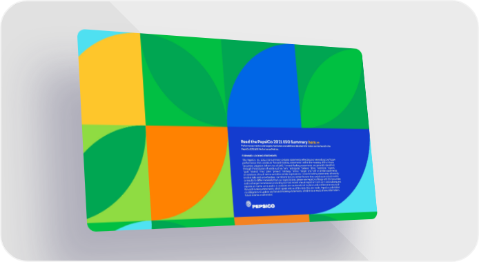 FORWARD-LOOKING STATEMENTS This PepsiCo, Inc. 2021 ESG Summary contains statements reflecting our views about our future performance that constitute “forward-looking statements” within the meaning of the Private Securities Litigation Reform Act of 1995. Forward-looking statements are generally identified through the inclusion of words such as “aim,” “anticipate,” “believe,” “drive,” “estimate,” “expect,” “goal,” “intend,” “may,” “plan,” “project,” “strategy,” “strive,” “target” and “will” or similar statements or variations of such terms and other similar expressions. Forward-looking statements inherently involve risks and uncertainties. For information on certain factors that could cause actual events or results to differ materially from our expectations, please see PepsiCo’s filings with the Securities and Exchange Commission, including its most recent annual report on Form 10-K and subsequent reports on Forms 10-Q and 8-K. Investors are cautioned not to place undue reliance on any such forward-looking statements, which speak only as of the date they are made. PepsiCo undertakes no obligation to update any forward-looking statements, whether as a result of new information, future events or otherwise. Read the PepsiCo 2021 ESG Summary here >> Performance metrics and targets, footnotes and additional detailed information can be found in the PepsiCo 2021 ESG Performance Metrics .