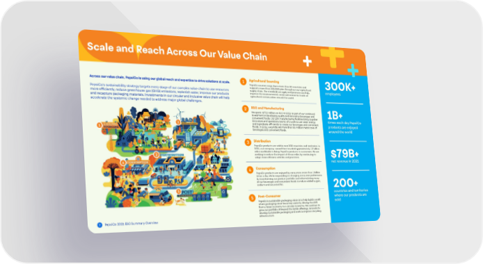 Across our value chain, PepsiCo is using our global reach and expertise to drive solutions at scale. PepsiCo’s sustainability strategy targets every stage of our complex value chain to use resources more efficiently, reduce greenhouse gas (GHG) emissions, replenish water, improve our products and recapture packaging materials. Investments in our circular and inclusive value chain will help accelerate the systemic change needed to address major global challenges. 1 2 3 4 5 Agricultural Sourcing PepsiCo sources crops from more than 30 countries and supports more than 100,000 jobs throughout our agricultural supply chain. The standards we apply and promote can help improve the environmental, social and economic health of agricultural communities around the world. Distribution PepsiCo products are sold in over 200 countries and territories. In 2021, our company-owned fleet traveled approximately 1.2 billion miles worldwide to bring PepsiCo products to customers. We are working to reduce the impact of those miles by continuing to adopt more efficient vehicles and practices. Consumption PepsiCo products are enjoyed by consumers more than 1 billion times a day. We’re responding to changing consumer preferences by transforming our product portfolio and reformulating many of our beverages and convenient foods to reduce added sugars, sodium and saturated fat. R&D and Manufacturing We spent >$750 million on R&D in 2021 as part of our continued investment in developing quality and innovative beverages and convenient foods. Our 294 manufacturing facilities bring together innovators and operations teams who work to use water, energy and ingredients efficiently to create our beverages and convenient foods. In 2021, we produced more than 90 million metric tons of beverages and convenient foods. Post-Consumer PepsiCo’s sustainable packaging vision is to help build a world where packaging never becomes waste by driving the shift from a linear economy to a circular economy. We continue to grow our portfolio of Beyond the Bottle offerings, innovate to develop sustainable packaging and work to improve recycling infrastructure. 1 2 3 4 5 300K+ employees 200+ countries and territories where our products are sold 1B+ times each day PepsiCo products are enjoyed around the world $79B+ net revenue in 2021 Scale and Reach Across Our Value Chain 2 PepsiCo 2021 ESG Summary Overview