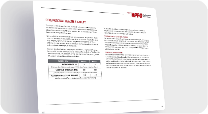 25 OCCUPATIONAL HEALTH & SAFETY The safety of our associates is a top priority. The wellbeing of everyone that forms part of the PFG team is a vital component for our success. In this regard, we are committed to providing a safe and healthy work environment for all our associates, from the moment they join PFG and throughout their journey within the company. We have established comprehensive health and safety programs and an organizational structure to ensure all operations are aligned with the expectations set forth within PFG’s Health & Safety Policy. This policy is provided to all associates during their onboarding process at PFG and establishes the norms and requirements for managing all activities in accordance with safe and healthy practices for preventing injury and loss of life. As a result of strategic health and safety programs and initiatives, during fiscal 2021 we saw improvement in key safety performance metrics, including a 3% reduction in our Total Recordable Incident Rate (IR Rate), 12% decrease in our Lost-Time Case Rate (LTC Rate), and a significant 20% reduction in transportation-related accidents (AMM). The safety strategies that have contributed to improved safety performance encompass a variety of approaches, from behavior-based safety to hazard identification and control, to the implementation of cutting-edge technological safety solutions. PFG BEHAVIOR-BASED SAFETY (BBS) PROGRAM This program creates a safety partnership between team leaders and associates that focuses on the reduction and elimination of risky behavior through targeted observation and coaching. Safety improvement is achieved primarily by changing the behavior of associates and encouraging a strong safety culture. Over 4,000 observations have occurred since the implementation of the BBS Program in the fourth quarter of fiscal 2021, allowing for real-time coaching and ongoing safety feedback for associates. SAMSARA TELEMATICS PROGRAM We have installed on-board smart dash cameras that monitor driving behavior in the delivery and service maintenance vehicles within our fleet. These dash cams provide real-time audio alerts when detecting risky behavior (i.e. in-cab distractions, critical distance, lane departure, etc.). In addition, recorded events and metrics captured by this technology are used to identify coaching and feedback opportunities for improving drivers’ safe driving skills and behavior. This program has led to improved safety behavior behind the wheel, a core component for our journey towards achieving zero collisions and zero injuries. SAFETY KPIs FY2020 FY2021 INCIDENT RATE (IR) 7.01 6.78 IR Formula: =(No. of Osha Recordable Cases X 200,000) / No. of Employee Labor Hours Worked LOST TIME CASE RATE (LTC) 2.61 2.29 LTC Formula: =(No. of Lost Time Cases X 200,000) / No. of Employee Labor Hours Worked ACCIDENTS/MILLION MILES (AMM) 5.99 4.77 AMM Formula: =(No. of Transportation Accidents / (Transportation Miles/1,000,000)