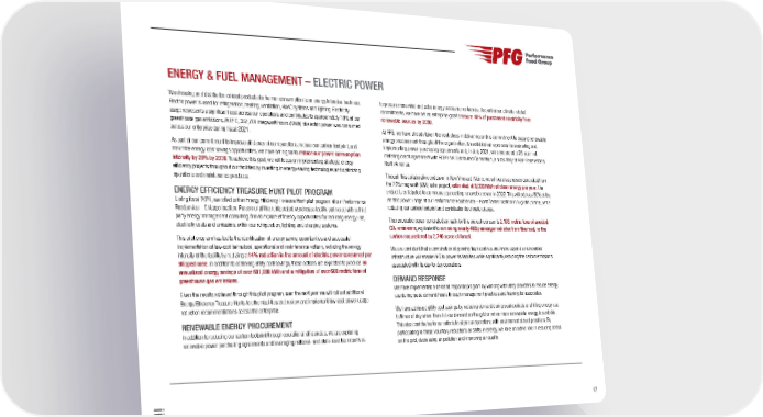 12 ENERGY & FUEL MANAGEMENT – ELECTRIC POWER Warehousing and distribution of food products for human consumption is an energy intensive business. Electric power is used for refrigeration, heating, ventilation, HVAC systems and lighting. Electricity usage represents a significant cost across our operations and contributes to approximately 18% of our greenhouse gas emissions. At PFG, 367,701 megawatt hours (MWh) of electric power was consumed across our enterprise during fiscal 2021. As part of our commitment to improve efficiency of our operations, reduce our carbon footprint, and maximize energy cost savings opportunities, we have set a goal to reduce our power consumption intensity by 20% by 2030 . To achieve this goal, we will focus on implementing strategic energy efficiency projects throughout our facilities by investing in energy-saving technologies and optimizing operations and maintenance practices. ENERGY EFFICIENCY TREASURE HUNT PILOT PROGRAM During fiscal 2021, we rolled out an Energy Efficiency Treasure Hunt pilot program at our Performance Foodservice – Chicago location. Personnel at this refrigerated warehouse facility partnered with a third- party energy management consulting firm to explore efficiency opportunities for reducing energy use, electricity costs and emissions within our refrigeration, lighting and charging systems. This pilot program has led to the identification of energy saving opportunities and successful implementation of low-cost behavioral, operational and maintenance actions, reducing the energy intensity of the facility by realizing a 14% reduction in the amount of electric power consumed per shipped case . In addition to achieving utility cost savings, these actions are expected to produce an annualized energy savings of over 681,000 kWh and a mitigation of over 600 metric tons of greenhouse gas emissions. Given the results achieved through this pilot program, over the next year we will roll out additional Energy Efficiency Treasure Hunts to other facilities and review and implement low-cost power usage reduction recommendations across the enterprise. RENEWABLE ENERGY PROCUREMENT In addition to reducing our carbon footprint through operational efficiencies, we are exploring renewable power purchasing agreements and leveraging national- and state-level tax incentives to procure more wind and solar energy across our enterprise. As part of our climate-related commitments, we have set an enterprise goal to secure 10% of purchased electricity from renewable sources by 2030. At PFG, we have already taken the next steps in delivering on this commitment to expand renewable energy procurement throughout the organization. We established a process for evaluating and implementing power purchasing agreements and, in July 2021, we announced a 20-year net metering credit agreement with EDPR NA Distributed Generation, a subsidiary of EDP Renewables North America. Through this collaborative endeavor in New Vineyard, Maine, we will purchase power generated from the 2.25 megawatt (MW) solar project, estimated at 3,000 MWh of clean energy per year . The project is anticipated to commence generating renewable power in 2022. This will address 80% of the electric power usage at our Performance Foodservice – NorthCenter location in Augusta, Maine, while reducing our carbon footprint and contribution to climate change. The renewable power generated annually by this project represents 2,103 metric tons of avoided CO 2 emissions , equivalent to removing nearly 460 passenger vehicles from the road, or the carbon sequestered by 2,746 acres of forest . We are confident that a combination of growing tax incentives and more expansive renewable infrastructure will enable PFG to power its facilities while significantly reducing the carbon emissions associated with its day-to-day operations. DEMAND RESPONSE We have implemented a demand response program by working with utility providers to reduce energy use during peak demand hours through management practices and training for associates. We have achieved utility cost savings by reducing demand during peak periods or shifting energy use to times of day when there is less demand on the grid or when more renewable energy is available. This also contributes to our efforts to align our operations with environmental best practices. By participating in these voluntary reductions or shifts in energy, we take an active role in reducing stress on the grid, decreasing air pollution and improving air quality.