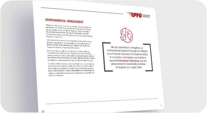 10 ENVIRONMENTAL MANAGEMENT At Performance Food Group, we strive to be a responsible environmental steward by protecting the environment for future generations. We comply with all environmental laws and regulations and are committed to mitigating our environmental footprint through the efficient use of natural resources, the implementation of innovative technologies and solutions across PFG, and the advancement of sustainable practices throughout our supply chain. At the center of this commitment is our Environmental Policy that outlines individual and shared responsibilities for the implementation of environmental management standards and best practices pertaining to environmental impact reduction, risk management, stakeholder engagement and ESG reporting. Environmental risks are registered and monitored by the company’s Enterprise Risk Management (ERM) function and are integrated into our business continuity contingency plans and emergency action protocols for applicable locations. Significant environmental risks are included within the company’s enterprise business risk register and updates are regularly provided to the Audit Committee of the Board of Directors. As part of our efforts to improve our environmental performance, we have established environmental baselines, targets and performance metrics in key matters central to our ESG Strategy: energy efficiency, renewable energy, climate change, greenhouse gas and waste management. Progress on these strategic environmental targets and initiatives is reported to the Nominating and Corporate Governance Committee of the Board on a quarterly basis. We are committed to mitigating our environmental footprint through the efficient use of natural resources, the implementation of innovative technologies and solutions across Performance Food Group , and the advancement of sustainable practices throughout our supply chain.