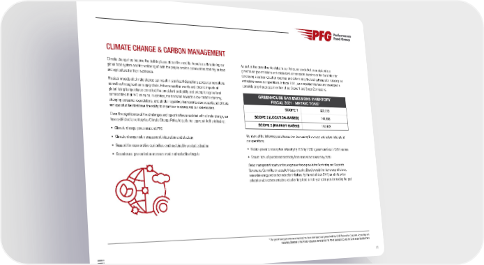 11 CLIMATE CHANGE & CARBON MANAGEMENT Climate change has become the defining issue of our time and its impacts are threatening our global food system and the wellbeing of both the people and the communities that rely on food and agriculture for their livelihoods. Physical impacts of climate change can result in significant disruptions across our operations as well as throughout our supply chain. Extreme weather events and chronic impacts of global rising temperatures can affect the consistent availability and pricing for agricultural commodities that PFG relies on. In addition, the transition towards a low-carbon economy, changing consumer expectations, and stricter regulatory frameworks also present a set of risks and opportunities that have the ability to impact our business and our stakeholders. Given the significance of the challenges and opportunities associated with climate change, we have published an enterprise Climate Change Policy to guide our approach to the following: • Climate change governance at PFG • Climate change risk management integration and strategy • Support for regenerative agriculture and sustainable product adoption • Greenhouse gas emission measurement and reduction targets As part of the commitments stated in our Policy, we conducted an analysis of our greenhouse gas emissions and established an emissions baseline as the foundation for developing a carbon reduction roadmap and determining the best pathways for reducing our emissions across our operations. In fiscal 2021, we completed this task and developed a complete greenhouse gas inventory of our Scope 1 and Scope 2 emissions. We also set the following goals focused on decreasing the energy and carbon intensity of our operations: • Reduce power consumption intensity by 20% by 2030 against our fiscal 2020 baseline • Secure 10% of purchased electricity from renewable sources by 2030 Senior management reports on the progress on these goals to the Nominating and Corporate Governance Committee on a quarterly basis, ensuring Board oversight on key energy efficiency, renewable energy and carbon reduction initiatives. By the end of fiscal 2022, we aim to set an enterprise-wide carbon emissions reduction target and a multi-year action plan for meeting the goal. GREENHOUSE GAS EMISSIONS INVENTORY FISCAL 2021 - METRIC TONS 1 SCOPE 1 663,670 SCOPE 2 (LOCATION-BASED) 149,896 SCOPE 2 (MARKET-BASED) 150,403 1 Our greenhouse gas emissions inventory has been developed in alignment with the GHG Protocol for Corporate Accounting and Reporting Standard of the World Resources Institute and the World Business Council for Sustainable Development.