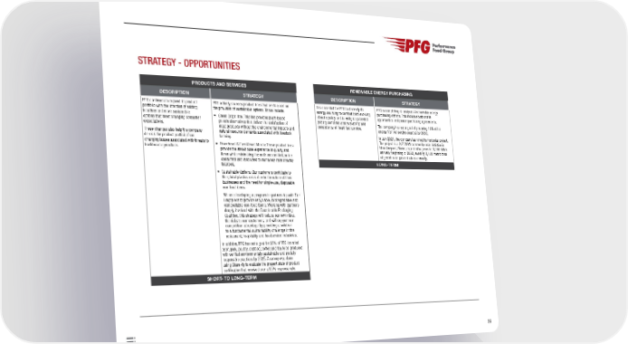 36 STRATEGY - OPPORTUNITIES PRODUCTS AND SERVICES DESCRIPTION STRATEGY PFG continues to expand its product portfolio with the intention of adding healthier and more sustainable options that meet changing consumer expectations. These changes also help the company de-risk the product portfolio from changing issues associated with threats to traditional agriculture. PFG actively sources product lines that are focused on the provision of sustainable options. Those include: • Green Origin line: This line provides plant-based protein alternatives that deliver the satisfaction of meat products without the environmental impacts and natural resource demands associated with livestock farming. • Braveheart & FarmSmart Meats: These product lines provide the steakhouse experience in quality and flavor while minimizing the methane emitted, water consumed and land used to humanely raise healthy livestock. • Sustainable Options: Our customers contribute to the global plastics crisis due to the nature of their businesses and the need for single-use, disposable non-food items. We are developing a program in partnership with Tier I suppliers to provide recyclable, biodegradable and compostable non-food items. Working with partners deeply involved with the Sustainable Packaging Coalition, this strategy will reduce our own risks, the risks to our customers, and will support our competitive advantage by providing a solution to a fundamental sustainability challenge in the restaurant, hospitality and foodservice industries. In addition, PFG has set a goal for 90% of PFG-branded beef, pork, poultry, seafood, coffee and tea to be produced with verified environmentally sustainable and socially responsible practices by 2025. A survey was done using Share-Ify to evaluate the present state of product certification that received over a 95% response rate. SHORT- TO LONG-TERM RENEWABLE ENERGY PURCHASING DESCRIPTION STRATEGY It is essential for PFG to diversify its energy sourcing to combat both evolving climate policy and to mitigate potential pricing concerns and availability and consistency of fossil fuel service. PFG is completing an analysis of renewable energy purchasing options. This includes both onsite opportunities and power purchasing agreements. The company has set a goal of procuring 10% of its energy from renewable sources by 2030. In July 2021, the company launched its first solar project. The project is a 2.25 MW community solar initiative in New Vineyard, Maine, expected to generate 3,000 MWh annually beginning in 2022, avoiding 2,103 metric tons of greenhouse gas emissions annually. LONG-TERM