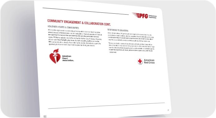 27 COMMUNITY ENGAGEMENT & COLLABORATION CONT. HEALTHIER HEARTS & COMMUNITIES PFG is continuing to invest in a community partnership with the American Heart Association, primarily focused in Richmond where we are headquartered. Teams of associates in Richmond are supporting this cause and the local Heart Walk through active participation and fund- raising. PFG took a leadership role for the event as the Nutrition Security Sponsor. This aligns with our commitment to fighting food insecurity and to supporting healthier communities. PFG’s sponsorship for a campaign to promote healthy donations to foodbanks supports the opportunity for those in need to have healthier options for feeding their families. RESPONDING TO DISASTERS When a disaster strikes, PFG partners with local chapters of the American Red Cross. We provide food and water donations, match our associates’ financial contributions, and leverage our nationwide network to provide logistics support and help deliver relief to communities in need. We are committed to providing comfort and sustenance to those most in need. This year, our disaster response included financial contributions to World Central Kitchen after communities in Texas were hard hit by severe storms. WCK’s mission to address hunger inspired us to provide financial support, as well as continue to offer our distribution expertise to assist the organization with delivery of food and other supplies quickly, when they are needed most.