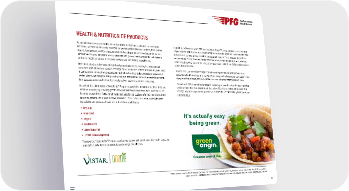 20 HEALTH & NUTRITION OF PRODUCTS As societal awareness around the connection between diet, food quality and human health increases, we have continuously expanded our portfolio of healthier food options, from certified organic, low-sodium, and low-sugar, to products free of all eight common food allergies. Our commitment to providing more product offerings with greater health and nutrition attributes is central to meeting changes in consumer preferences and shifting market trends. From food allergies to low-sodium diets to religious dietary needs, meeting the wide range of consumer product needs is always a challenge for our customers and the food industry. With 18% 3 of our business coming from products with distinct and certified dietary, health and sustainability- related claims, we recognize that providing inclusive and healthier options is essential to our long- term success as well as the long-term welfare of our customers and end consumers. As part of this effort, Vistar’s “Good to Go” Program supports the adoption of healthier diets and healthier snacking by providing greater access to nutritious alternatives. With more than 1,800 items to choose from, “Good To Go” is an easy way for our customers to find natural snack and beverage options. For a product to be included in “Good to Go”, it must be made with clean ingredients and possess at least one of the following attributes: • Organic • Non-GMO • Vegan • Gluten-Free • Zero Trans Fat • USDA School Approved To make the “Good to Go” Program possible, we partner with small, emerging health-conscious brands to distribute their products to a wide range of customers. In addition, in November 2020 PFG launched Green Origin™, a new exclusive brand consisting of plant-based protein products to provide additional options for vegan and flexitarian diets. Initial items include burgers, grinds, breakfast sausages and nuggets. These products are produced exclusively for PFG by Greenleaf Foods, which has a long history of pioneering and perfecting plant-based proteins. Many of the products are also vegan-certified, non-GMO-certified, soy-free, gluten-free and kosher. In March 2021, we added Green Origin™ Plant-based Pepperoni to our brand portfolio. Since pepperoni is the #1 pizza topping in the U.S., we are now providing this pleasing, plant-based version of pepperoni that is vegan, non-GMO-certified and does not contain artificial flavors or colors. As we look to 2030, we will be significantly expanding our selection of plant-based alternative proteins, milks and conventional snack alternatives. We will also partner with suppliers that leverage regenerative production practices to minimize the use of harmful synthetic pesticides and herbicides. 3 These figures account for all sales excluding Eby-Brown. The product label claims include reduced fat, low sodium, reduced sodium, lactose free, RBST free, probiotic, vegan, trans fat free, plant based, organic, shade grown, Humanely Raised, wild, free range, Fair Trade, Halal, Kosher, gluten-free, MSC certified
