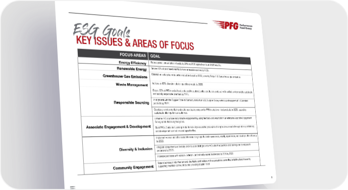 8 FOCUS AREAS GOAL Energy Efficiency Reduce power consumption intensity by 20% by 2030 against our fiscal 2020 baseline. Renewable Energy Secure 10% of purchased electricity from renewable sources by 2030. Greenhouse Gas Emissions Establish an enterprise-wide carbon reduction target by 2022, covering Scope 1 & 2 greenhouse gas emissions. Waste Management Achieve an 80% diversion rate for operational waste by 2030. Responsible Sourcing Ensure 90% of PFG branded beef, pork, poultry, seafood, coffee and tea are produced with verified environmentally sustainable and socially responsible practices by 2025. In alignment with the Supplier Code of Conduct, conduct an ESG Supplier Survey with 95% of suppliers of PFG branded products by 2022. Develop an environmentally preferable purchasing program for PFG branded non-food products by 2023, expanding sustainable offerings for our customers. Associate Engagement & Development Enhance PFG’s culture and promote engagement by using feedback and results from an enterprise Associate Engagement Survey conducted every two years. Build PFG’s Center for Learning model to help align associate goals while driving business results through delivery of training and development curriculums and opportunities. Diversity & Inclusion Implement women and other associate resource groups to create awareness, amplify experiences, and develop cultural fluency by 2022. Integrate comprehensive diversity and inclusion strategies into PFG’s talent acquisition and learning and development processes by 2023. Increase purchases with woman-, veteran-, and minority-owned businesses by 25% by 2030. Community Engagement Expand advocacy, volunteerism and charitable contributions with organizations committed to fighting food insecurity, supporting healthier communities and providing disaster relief. KEY ISSUES & AREAS OF FOCUS ESG Goals