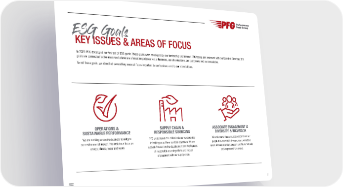 7 KEY ISSUES & AREAS OF FOCUS ESG Goals In 2021 PFG developed our first set of ESG goals. These goals were developed by our leadership and internal ESG teams and reviewed with our Board of Directors. The goals are connected to the areas we believe are of most importance to our business, our shareholders, our customers and our associates. To set these goals, we identified several key areas of focus important to our business and to our stakeholders. OPERATIONS & SUSTAINABLE PERFORMANCE We are working across the business to mitigate our environmental impact. This includes a focus on energy, climate, water and waste. SUPPLY CHAIN & RESPONSIBLE SOURCING PFG understands the critical role our vendors play in helping us achieve our ESG objectives. We are actively focused on the development and deployment of responsible sourcing efforts and robust engagement with our supply chain. ASSOCIATE ENGAGEMENT & DIVERSITY & INCLUSION We understand that our success depends on our people. It is essential that we provide a workplace where all team members, present and future, feel safe and empowered to succeed.