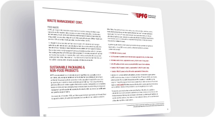 15 WASTE MANAGEMENT CONT. FOOD WASTE At PFG, we recognize the immediate environmental and societal challenges that food waste represents and its impact on natural resources required for food production, including water, land and energy, as well as its contribution to greenhouse gas emissions and food insecurity. In fiscal 2021, we generated a total of 46,601,483 pounds of food waste. Of that, 18,261,239 pounds or 39% of our food waste generated, was diverted from landfills. To mitigate the risks associated with food loss and waste, PFG establishes and leverages partnerships with national and regional foodbanks that help us address food insecurity while also reducing our company’s carbon footprint. We also partner with our suppliers to ensure they employ environmental management policies and standards and are actively minimizing their waste generation within their production processes. For example, we work with some of our branded beef suppliers in improving the meat trimming specifications to decrease food waste generated at the restaurant level. This minimizes the amount of waste that ends up in the landfill, reducing carbon emissions associated with food decomposition. SUSTAINABLE PACKAGING & NON-FOOD PRODUCTS At PFG, we understand the environmental risk and impact that single-use plastics have on our oceans, soils, ecological habitats and on the climate. We have a strategy for reducing our contribution to packaging pollution and environmental degradation throughout the value chain by expanding our branded non-foods sustainable product offerings. This is only achievable by partnering with select non-food suppliers that provide recyclable, biodegradable and compostable foodservice items and have packaging design processes based on product lifecycle analysis and management, as well as systematic approaches to reducing water use, energy use, landfill waste and greenhouse gas emissions. As an example, in November 2020, our Vistar segment entered a partnership with Emerald Brand to expand the offering of sustainable disposables and essentials for our customers across the United States. Emerald Brand items include cutlery, cups, bowls and plates, containers, napkins, towels, toilet and facial tissue, and other essentials that are Tree-Free™ and free of petroleum- based plastic. The TreeFree™ items come from plant-based agricultural waste, providing an alternative to traditional paper products. As a sustainable alternative to petroleum-based plastics, Emerald Brand uses PLA or PHA which is compostable/biodegradable, BPA free, fluorocarbon free and USDA Certified BioBased. By partnering with Emerald Brand to provide products free of virgin wood fiber and petroleum- based plastics, in fiscal 2021 we were able to contribute to the following estimated environmental savings 2 : • 63,286 kWh of energy saved. • 54,378 pounds of greenhouse emissions saved, equivalent to 95,195 miles driven. • 950 total avoided trees, equivalent to saving 19,083 reams of copy paper. • 295,784 gallons of water saved, equivalent to 822 hours of lawn watering • Avoided 120,775 pound of plastic, equivalent to 10,869,779 plastic bags • Avoided 156,402 pounds of landfill waste, equivalent to 39 dumpsters. In January 2021, we also partnered with WestRock, one of our non-food items supplier partners for PFG-branded pizza boxes, to deliver the Sustainable Choices™ program with the aim of raising awareness around the recyclability of pizza boxes and their acceptance in residential recycling programs. Through this program, the pizza boxes provided to our customers include a QR code that leads to an online portal that allows consumers to look up their recycling guidelines by zip code as well as additional materials to bring clarity to the issue of corrugated pizza box recycling. For example, according to a study performed by WestRock, 73% of the U.S. population is estimated to have recycling programs available for pizza boxes, but many consumers are under the false impression that recycling pizza boxes is not allowed. By partnering with WestRock, we seek to clear this confusion, help customers make sustainable choices, and increase the volume of fiber returning to the circular economy. 2 Environmental savings estimates are provided by Emerald Brand and are based on conversion from products of the same weight made entirely of virgin wood fiber and/or petroleum-based plastic resin.