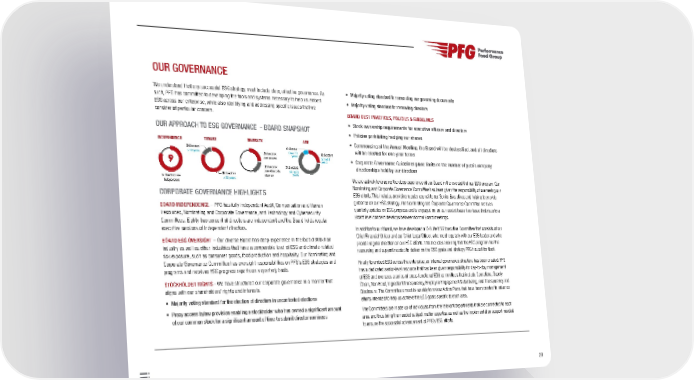 29 9 INDEPENDENCE TENURE DIVERSITY AGE 9 directors are independent 2 directors >10 years 9 directors <10 years 3 directors are women 2 directors are ethnically diverse 1 director Over 70 years 7 directors 61 to70 years 3 directors 50 to60 years OUR GOVERNANCE We understand that any successful ESG strategy must include clear, effective governance. As such, PFG has committed to developing the tools and systems necessary to help us embed ESG across our enterprise, while also identifying and addressing specific issues that we consider of particular concern. OUR APPROACH TO ESG GOVERNANCE - BOARD SNAPSHOT CORPORATE GOVERNANCE HIGHLIGHTS BOARD INDEPENDENCE – PFG has fully independent Audit, Compensation and Human Resources, Nominating and Corporate Governance, and Technology and Cybersecurity Committees. Eighty-two percent of directors are independent and the Board holds regular executive sessions of independent directors. BOARD ESG OVERSIGHT – Our diverse Board has deep experience in the food distribution industry as well as other industries that have a comparable level of ESG and climate-related risk exposure, such as consumer goods, food production and hospitality. Our Nominating and Corporate Governance Committee has oversight responsibilities on PFG’s ESG strategies and programs and receives ESG progress reports on a quarterly basis. STOCKHOLDER RIGHTS - We have structured our corporate governance in a manner that aligns with our shareholders’ rights and interests. • Majority voting standard for the election of directors in uncontested elections • Proxy access bylaw provision enabling a stockholder who has owned a significant amount of our common stock for a significant amount of time to submit director nominees • Majority voting standard for amending our governing documents • Majority voting standard for removing directors BOARD BEST PRACTICES, POLICIES & GUIDELINES • Stock ownership requirements for executive officers and directors • Policies prohibiting hedging our shares • Commencing at the Annual Meeting, the Board will be declassified, and all directors will be elected for one-year terms • Corporate Governance Guidelines place limits on the number of public company directorships held by our directors We are actively leveraging the deep experience of our Board in the oversight of our ESG program. Our Nominating and Corporate Governance Committee has been given the responsibility of overseeing our ESG efforts. This includes providing regular council to our Senior Executives and helping to provide guidance on our ESG strategy. The Nominating and Corporate Governance Committee receives quarterly updates on ESG progress and is engaged on an as-needed basis if an issue that rises to a Board level concern develops between formal Board meetings. In addition to our Board, we have developed a C-Suite ESG Executive Committee that consists of our Chief Financial Officer and our Chief Legal Officer, who meet regularly with our ESG leader and who provide regular direction on our ESG efforts. This includes ensuring that the ESG program has the resourcing and support needed to deliver on the ESG goals and strategy PFG has set for itself. Finally, to embed ESG across the enterprise, an internal governance structure has been created. PFG has a dedicated senior-level resource that has been given responsibility for day-to-day management of ESG and oversees a series of cross-functional ESG committees that include Operations, Supply Chain, Non-Food, Ingredient Transparency, Employee Engagement & Wellbeing, and Transparency and Disclosure. The Committees meet bi-weekly to review Action Plans that have been created to advance efforts intended to help us achieve the ESG goals specific to each area. The Committees are made up of individuals from the relevant departments that are connected to each area and thus bring the needed subject matter expertise as well as the implementation support needed to ensure the successful advancement of PFG’s ESG efforts.