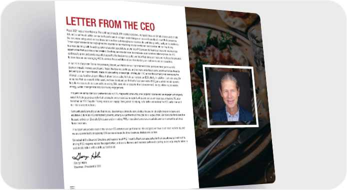 LETTER FROM THE CEO Fiscal 2021 was an eventful year. The continued impacts of the global pandemic, increased focus on climate change and climate risk, and a continued call for companies to participate in a larger social dialogue on race and equality all meant that companies like ours were being called on to address far more than just managing our business for profitable growth, quality and consistency. These unprecedented times highlighted the importance of embedding environmental and social action into our day-to-day business planning, both to address external societal expectations and to help PFG prepare for business risks and new business opportunities that such focus has created. One thing we know for sure, business-as-usual is not an option anymore. As PFG continues to grow and provide essential support to the foodservice sector, we know that doing so means we must also be prepared to show how we are leveraging ESG to address the expectations of our shareholders, our customers and our associates. In our 2020 Corporate Social Responsibility Report, we introduced our commitment to the principles that guide our ESG journey: Impact, Innovate and Inspire. Today, that journey continues, and we have undertaken some significant steps towards delivering on our commitment. These include setting a meaningful strategy for ESG across the company and leveraging the internal, cross-functional committees that we have created to help us manage our ESG efforts. In addition, I am very proud to announce that as a result of this work, we have developed our first set of comprehensive ESG goals, which include specific targets in areas such as responsible sourcing, D&I, associate engagement and development, energy efficiency, renewable energy, waste management and community engagement. This year we announced our partnership for a 2.25 megawatt community solar project in Maine and we engaged a third-party expert to help us analyze potential renewable energy purchasing opportunities and our greenhouse gas emissions. We also launched an ESG Supplier Survey across our supply chain, which is helping us to better understand the ESG performance of our many vendor partners. I am particularly proud to share that we are developing a comprehensive strategy focused on strengthening an inclusive and equitable culture at PFG and fostering diversity among our partnerships throughout our supply chain. We have a full-time executive focused entirely on Diversity & Inclusion and in meeting PFG’s imperative to provide an equitable work environment for all of our team members. This report will provide more detail on our ESG activities and performance. We recognize we have much more work to do, and we are committed to integrating ESG across all aspects of our business strategy and culture. On behalf of the Board of Directors and leadership at PFG, I want to thank our associates for their exceptional commitment to driving ESG progress across the organization, and our customers and business partners for joining us in our journey to deliver a sustainable future with nutritious food for all. George Holm Chairman, President & CEO 4