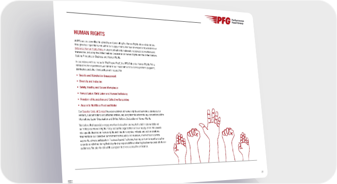 21 HUMAN RIGHTS At PFG we are committed to upholding and promoting the Human Rights of our stakeholders throughout our operations and within our supply chains. We have developed and published our Enterprise Human Rights Policy in alignment with internationally recognized conventions and frameworks, including the United Nations Declaration of Human Rights and the United Nations Guiding Principles on Business and Human Rights. In accordance with our value to “Put People First”, the PFG Enterprise Human Rights Policy establishes the expectations we extend to our associates and business partners (suppliers, distributors and other third parties) with respect to: • Society and Stakeholder Engagement • Diversity and Inclusion • Safety, Healthy and Secure Workplaces • Forced Labor, Child Labor and Human Trafficking • Freedom of Association and Collective Bargaining • Access to Nutritious Food and Water Our Supplier Code of Conduct has also established human rights and workforce standards for vendors, subcontractors and affiliated entities, requiring them to adhere to key conventions of the International Labor Organization and United Nations Declaration of Human Rights. We believe that associate engagement and education are key to the full implementation of our Enterprise Human Rights Policy across the organization and our supply chain. We provide role-specific training on human rights and how to recognize, mitigate and act on violations that reinforce our collective commitment to this policy. For example, in one of our business segments, drivers participate in Truckers Against Trafficking training on how to report and act on suspicious activities during their day-to-day responsibilities delivering foodservice products to our customers. We plan to roll out this program to drivers across the enterprise.