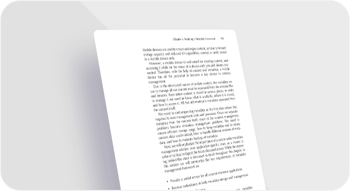 Chapter 5: Realizing a Metadata Framework 149 Mobile devices are used to create and enjoy content, yet due to limited storage capacity and reduced UI capabilities, content is rarely stored in a mobile device only. However, a mobile device is well suited for creating content, and accessing it while on the move. It is always with you and always con- nected. Therefore, with the help of context and metadata, a mobile device has all the potential to become a key device to content management. Due to the distributed nature of mobile content, the metadata we use to manage all our content must be separated from the content fi les and binaries. Even when content is stored in various places, in order to manage it we need to know what is available, where it is stored, and how to access it. All that information is metadata separated from the content itself. We need to start respecting metadata as the fi rst-class citizen that requires its own management tools and processes. Once we separate metadata from the content itself, some of the content management problems become metadata management problems. We need to ensure effi cient storage usage, how to keep metadata and its binary content data synchronized, how to handle different versions of meta- data, and how to maintain backup of metadata. Next, we will emphasize the importance of a system-wide metadata management solution over application-specifi c ones, as a means to solve or (at least mitigate) the issues discussed above. While the reason- ing behind this claim is discussed in detail throughout this chapter, in this section we will summarize the key requirements of metadata management framework as: • Provide a useful service for all content-intensive applications. • Remove redundancy in both metadata storage and management. • Aim at run-time effi ciency. • Allow future extensions to content types and metadata defi nitions. • Allow interoperability between applications, devices, and content types. • Support experiences by the means of cross-media relationships. A requirement for any system is to justify its existence. This means that we just cannot make a theoretically beautiful architecture. It also must work in real life and in all kinds of mobile devices with limited