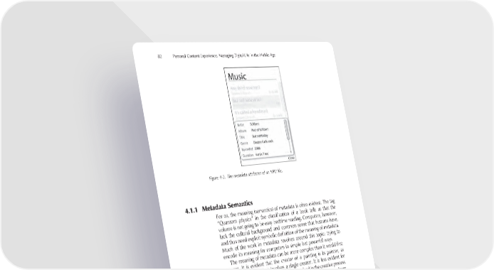 82 Personal Content Experience: Managing Digital Life in the Mobile Age Figure 4-2. The metadata attributes of an MP3 fi le. 4.1.1 Metadata Semantics For us, the meaning (semantics) of metadata is often evident. The tag “Quantum physics” in the classifi cation of a book tells us that the volume is not going to be easy bedtime reading. Computers, however, lack the cultural background and common sense that humans have, and thus need explicit symbolic defi nition of the meaning of metadata. Much of the work in metadata revolves around this topic: trying to encode its meaning for computers in simple but powerful ways. The meaning of metadata can be more complex than it would fi rst appear. It is evident that the creator of a painting is its painter, as usually that form of art involves a single creator. It is less evident for other works where multiple people are involved in the creative process. For instance, who is the creator of a blockbuster fi lm – the producer, the director, or perhaps the main actor? The issue gets more compli- cated when the object that the metadata describes is a part of another object: a song that belongs to the soundtrack of a movie, or the content object is a photo of a famous painting. The importance of semantics will be discussed further in section 4.4. A fundamental mechanism, critical for navigation and use of content, is a catalogue. Metadata is used as the common vocabulary to frame information that we seek to use and these metadata elements are stored and served through a user-accessible catalogue.