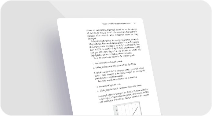 Chapter 3: Mobile Personal Content Uncovered 57 provide an understanding of personal content features that affect us all, but also to bring up some fundamental topics that need to be addressed when personal content management systems are being developed. Perhaps the most important feature of personal content is its incred- ible growth rate. The amount of digital photos, for example, is growing at an enormous rate: according to one study, it is estimated that from 2004 to 2009, the number of digital photos taken increases by 24% each year (IDC 2006) (Figure 3-4). And this estimate includes only digital photos, not the multitude of other content types. There are two obvious reasons for the explosive growth: 1. New content is continuously created. 2. Existing analogue content is converted into digital form. A typical example of the fi rst category is taking a photo with a digital camera. Good examples in the second category are scanning old printed photos or digitizing vinyl LPs. Two more reasons, not as obvious, can be identifi ed: 3. New content types are born. 4. Existing digital content is transformed into another format. An example of the third category is a playlist (a fi le that contains links to the songs that together form the playlist), which was not a widely used content type a decade ago. Taking a screenshot of a computer Figure 3-4. Estimated digital photo growth rate from 2004 to 2009 (IDC 2006). The values on the y-axis are only indicative, since the estimated number of photos taken in 2004 varies wildly between 20 and 235 billion, depending on the source.