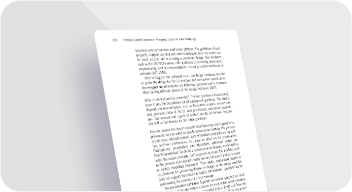 248 Personal Content Experience: Managing Digital Life in the Mobile Age practices and conventions used in the platform. The guidelines, if used properly, support learning and understanding on how the system can be used, as they aid in creating a consistent design. Also standards, such as the ISO 9241 series, offer guidance by providing information, requirements, and recommendations related to certain hardware or software (ISO 1998). After sorting out the technical issues, the design continues. In order to guide the design for the UI structure and component specifi cation, the designer should consider the following questions and try to answer them during different phases of the design (Aaltonen 2007). What content should be presented? This fi rst question is fundamental, since it sets the boundaries for all subsequent questions. The answer depends on several factors, such as the current context, current user task, previous states of the UI, user preferences, and device capabili- ties. The amount and type(s) of content should be defi ned, because this will set the frames for the other questions. How to present the chosen content? After knowing what is going to be presented, we can select a suitable presentation method. The previous system state, selected content, system hardware and software capabili- ties, and user preferences, etc., have an effect on the presentation. Furthermore, presentation and interaction, addressed below, are heavily interlinked. To defi ne a presentation technique, we should fi rst select the output modality, such as speech or visual. The modality used in the previous state should usually remain, because it makes no sense to switch modalities frequently. Then again, synthesized speech is troublesome for presenting dozens of images, as the output modality does not support the content modality. Alternatively, speech is fi ne for synthesizing the contents of a text message. The presentation technique depends on content type, but we need to consider what information is shown for each object (what metadata attributes and their values are presented and so forth) and how the information is presented: as text, graphics, or audio. If the visual pre- sentation is used, the screen resolution, orientation, and size affect the layout to a great extent. How to interact with the content objects and information? The objects and presentation guide interaction, which depends on the previous system state and selected objects, as well as system hardware and soft- ware capabilities, user preferences, and so on. The presentation tech- nique is tightly linked with the input capabilities of the device, because the presentation should be such that the user can interact with it. Also, the interaction occurs on several levels – with the highlighted object,