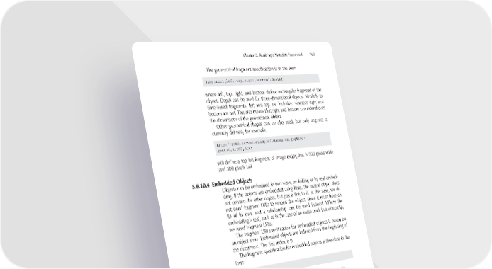 Chapter 5: Realizing a Metadata Framework 169 The geometrical fragment specifi cation is in the form #img:rect(left,top,right,bottom[,depth]) where left, top, right, and bottom defi ne rectangular fragment of the object. Depth can be used for three-dimensional objects. Similarly to time-based fragments, left and top are inclusive, whereas right and bottom are not. This also means that right and bottom can extend over the dimensions of the geometrical object. Other geometrical shapes can be also used, but only img:rect is currently defi ned, for example, http://some.server.example/images/ex.jpg#img: rect(0,0,200,300) will defi ne a top left fragment of image ex.jpg that is 200 pixels wide and 300 pixels tall. 5.6.10.4 Embedded Objects Objects can be embedded in two ways, by linking or by real embed- ding. If the objects are embedded using links, the parent object does not contain the other object, but just a link to it. In this case, we do not need fragment URIs to embed the object, since it must have an ID of its own and a relationship can be used instead. Where the embedding is real, such as in the case of an audio track in a video clip, we need fragment URIs. The fragment URI specifi cation for embedded objects is based on an object array. Embedded objects are indexed from the beginning of the document. The fi rst index is 0. The fragment specifi cation for embedded objects is therefore in the form #object[index] where index is an index to the embedded object, for example, fi le://docs/word.doc#object[5] refers to the sixth embedded object in word.doc. 5.6.11 Extending the Ontology As discussed earlier, it is almost impossible to model everything that any software developer may invent in the future. For that reason the
