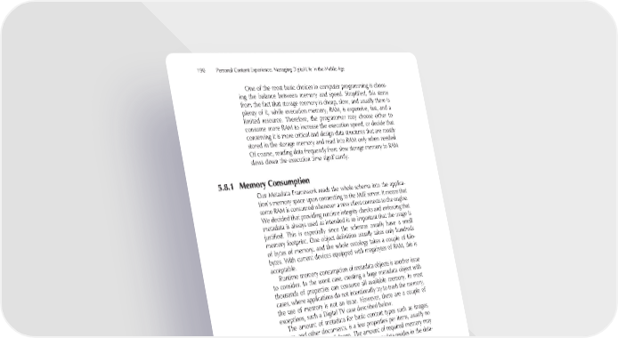 190 Personal Content Experience: Managing Digital Life in the Mobile Age One of the most basic choices in computer programming is choos- ing the balance between memory and speed. Simplifi ed, this stems from the fact that storage memory is cheap, slow, and usually there is plenty of it, while execution memory, RAM, is expensive, fast, and a limited resource. Therefore, the programmer may choose either to consume more RAM to increase the execution speed, or decide that conserving it is more critical and design data structures that are mostly stored in the storage memory and read into RAM only when needed. Of course, reading data frequently from slow storage memory to RAM slows down the execution time signifi cantly. 5.8.1 Memory Consumption Our Metadata Framework reads the whole schema into the applica- tion’s memory space upon connecting to the MdE server. It means that some RAM is consumed whenever a new client connects to the engine. We decided that providing runtime integrity checks and enforcing that metadata is always used as intended is so important that the usage is justifi ed. This is especially since the schemas usually have a small memory footprint. One object defi nition usually takes only hundreds of bytes of memory, and the whole ontology takes a couple of kilo- bytes. With current devices equipped with megabytes of RAM, this is acceptable. Runtime memory consumption of metadata objects is another issue to consider. In the worst case, creating a huge metadata object with thousands of properties can consume all available memory. In most cases, where applications do not intentionally try to trash the memory, the use of memory is not an issue. However, there are a couple of exceptions, such a Digital TV case described below. The amount of metadata for basic content types such as images, songs, and other documents, is a few properties per items, usually no more than a couple of dozen. The amount of required memory may be as high as a few kilobytes, but usually metadata resides in the data- base and is used only in small chunks at a time. Digital TV content produces some challenges. The DVB standard used in Europe and elsewhere usually have program guide information for a week. The total amount of EPG data can grow to hundreds of megabytes. Of course, all of it is not needed at one time, but it still needs to be stored in the database and also harvested on arrival. DVB EPG is not yet widely used in mobile devices, but we need to proactively design how to process, store, and use megabytes of data in the framework. The current system is not yet optimized for such a usage.