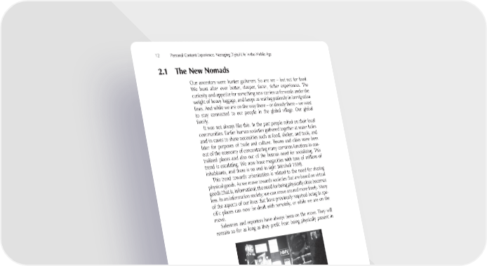 12 Personal Content Experience: Managing Digital Life in the Mobile Age 2.1 The New Nomads Our ancestors were hunter gatherers. So are we – but not for food. We hunt after ever better, deeper, faster, richer experiences. The curiosity and appetite for something new carries us forwards under the weight of heavy luggage, and keeps us waiting patiently in immigration lines. And while we are on the way there – or already there – we want to stay connected to our people in the global village. Our global family. It was not always like this. In the past people relied on their local communities. Earlier human societies gathered together at water holes and in caves to share necessities such as food, shelter, and tools, and later for purposes of trade and culture. Towns and cities were born out of the economy of concentrating many common functions in cen- tralized places and also out of the human need for socializing. This trend is escalating. We now have megacities with tens of millions of inhabitants, and there is no end in sight (Mitchell 1999). This trend towards urbanization is related to the need for sharing physical goods. As we move towards societies that are based on virtual goods (that is, information), the need for being physically close becomes less. In an information society, we can move around more freely. Many of the aspects of our lives that have previously required being in spe- cifi c places can now be dealt with remotely, or while we are on the move. Salesmen and reporters have always been on the move. They will remain so for as long as they profi t from being physically present in Figure 2-1. Urban crowds in Tokyo, a mobile megacity.