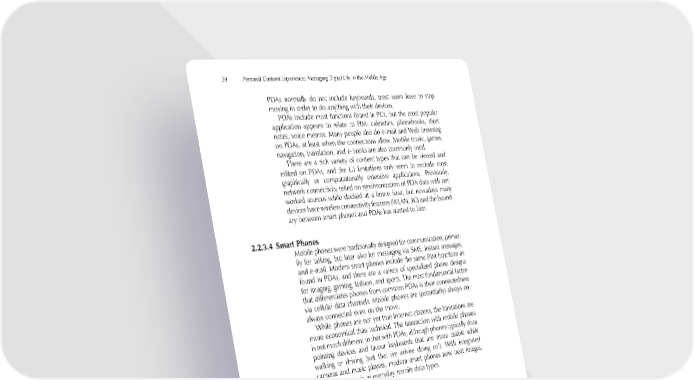24 Personal Content Experience: Managing Digital Life in the Mobile Age PDAs normally do not include keyboards, most users have to stop moving in order to do anything with their devices. PDAs include most functions found in PCs, but the most popular application appears to relate to PIM: calendars, phonebooks, short notes, voice memos. Many people also do e-mail and Web browsing on PDAs, at least when the connections allow. Mobile music, games, navigation, translation, and e-books are also commonly used. There are a rich variety of content types that can be viewed and edited on PDAs, and the UI limitations only seem to exclude most graphically or computationally extensive applications. Previously, network connectivity relied on synchronization of PDA data with net- worked sources while docked at a home base, but nowadays many devices have wireless connectivity features (WLAN, 3G) and the bound- ary between smart phones and PDAs has started to blur. 2.2.3.4 Smart Phones Mobile phones were traditionally designed for communication, primar- ily for talking, but later also for messaging via SMS, instant messages, and e-mail. Modern smart phones include the same PIM functions as found in PDAs, and there are a variety of specialized phone designs for imaging, gaming, fashion, and sports. The most fundamental factor that differentiates phones from common PDAs is their connectedness via cellular data channels. Mobile phones are (potentially) always on, always connected even on the move. While phones are not yet true Internet citizens, the limitations are more economical than technical. The interaction with mobile phones is not much different to that with PDAs, although phones typically shun pointing devices and favour keyboards that are more usable while walking or driving (not that we advise doing so!). With integrated cameras and music players, modern smart phones now treat images, videos, and music as everyday mobile data types. 2.2.4 Accessories and Other Devices The three categories described above may have many accessories. Here we divide them into the following categories based on their purpose: • Improving mobility. For example, a headset for hands-free voice communication; extending use with high capacity batteries or travel chargers for car lighter or USB port; enhancing wearability or carryability with belt cases, pouches, straps, and armbands;
