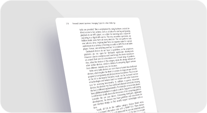 278 Personal Content Experience: Managing Digital Life in the Mobile Age tasks are provided. This is emphasized by using hardware controls for direct access to key actions, such as a button for starting and pausing playback in an MP3 player, or a slider for zooming and a button for capturing in a digital still camera. The rest, secondary operations, are hidden inside some form of menu structure. The user performs only one task at a time, implying that there are separate states for capture and browse in a camera, or listening to a radio or MP3 fi les in an audio player. Hence, task switching need not be considered. Dedicated devices do not have UI guidelines, as the proprietary platforms are not open for third-party application development. However, due to consistency and brand image, the device manufactur- ers extend their own UI conventions over a broad range of products. Also, often the devices of this category mimic the design solutions of other similar devices, which is obvious if comparing digital cameras from different manufactures, for instance. Swiss army knife devices are more feature-loaded than dedicated devices, which implies that their UI consists of a large amount of multi- purpose UI components and physical interaction devices. The structure of the UI is dominantly hierarchy-based, but the increased number of technologies and features lead to a broader and wider menu struc- ture for accessing functionality. In addition to generic interaction devices, the devices may have additional physical controls for stressing the key or differencing functionality. For example, some mobile phones have additional playback or capture controls. Support for multi-tasking is still limited, mostly due to the limitations of the computing platform (consider the use case above). Concerning third-party application development, the devices may have guidelines and conventions for user interface design, as they usually support technologies such as Java. Nearly all UIs in the toolbox category devices blend menu selection-based interaction style with a WIMP GUI. These devices have many pre-installed applications and the user can (relatively) easily install new applications. Thus, a novice user feels that the UI is complex to master. On the other hand, the devices may offer an opportunity to organize and personalize the menu structure so that it is easy and fast to use. This also implies a difference between the toolbox category and the other categories: the UI structure of toolbox devices rely more on the concept of an application than the other categories (see Chapter 7 for more discussion on mobile applications). For instance, from the end-user’s perspective, dedicated devices usually have “features” instead of “applications” and the same applies to most Swiss army knife devices. Toolbox devices are often preferred by experienced users who demand effi ciency and effectiveness in a single package, specifi cally