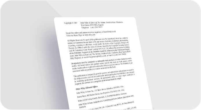 Copyright © 2007 John Wiley & Sons Ltd, The Atrium, Southern Gate, Chichester, West Sussex PO19 8SQ, England Telephone (+44) 1243 779777 Email (for orders and customer service enquiries): [email protected] Visit our Home Page on www.wiley.com All Rights Reserved. No part of this publication may be reproduced, stored in a retrieval system or transmitted in any form or by any means, electronic, mechanical, photocopying, recording, scanning or otherwise, except under the terms of the Copyright, Designs and Patents Act 1988 or under the terms of a licence issued by the Copyright Licensing Agency Ltd, 90 Tottenham Court Road, London W1T 4LP, UK, without the permission in writing of the Publisher. Requests to the Publisher should be addressed to the Permissions Depart- ment, John Wiley & Sons Ltd, The Atrium, Southern Gate, Chichester, West Sussex PO19 8SQ, England, or emailed to [email protected], or faxed to (+44) 1243 770620. Designations used by companies to distinguish their products are often claimed as trade- marks. All brand names and product names used in this book are trade names, service marks, trademarks or registered trademarks of their respective owners. The Publisher is not associated with any product or vendor mentioned in this book. This publication is designed to provide accurate and authoritative information in regard to the subject matter covered. It is sold on the understanding that the Publisher is not engaged in rendering professional services. If professional advice or other expert assistance is required, the services of a competent professional should be sought. Other Wiley Editorial Offi ces John Wiley & Sons Inc., 111 River Street, Hoboken, NJ 07030, USA Jossey-Bass, 989 Market Street, San Francisco, CA 94103-1741, USA Wiley-VCH Verlag GmbH, Boschstr. 12, D-69469 Weinheim, Germany John Wiley & Sons Australia Ltd, 42 McDougall Street, Milton, Queensland 4064, Australia John Wiley & Sons (Asia) Pte Ltd, 2 Clementi Loop #02-01, Jin Xing Distripark, Singapore 129809 John Wiley & Sons Canada Ltd, 6045 Freemont Blvd, Mississauga, ONT, L5R 4J3, Canada Wiley also publishes its books in a variety of electronic formats. Some content that appears in print may not be available in electronic books. Anniversary Logo Design: Richard J. Pacifi co British Library Cataloguing in Publication Data A catalogue record for this book is available from the British Library ISBN 978-0-470-03464-4 (PB) Typeset by SNP Best-set Typesetter Ltd., Hong Kong Printed and bound in Great Britain by Antony Rowe Ltd, Chippenham, England. This book is printed on acid-free paper responsibly manufactured from sustainable forestry in which at least two trees are planted for each one used for paper production.